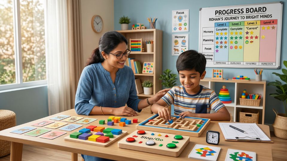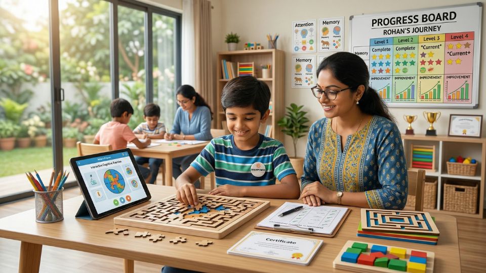 Parents are actively involved through regular feedback and guided home-based activities, including brain gym exercises and cognitive reinforcement tasks, which help in generalizing skills beyond therapy sessions. Over time, children demonstrate improved attention span, better organization, and enhanced ability to manage academic and daily challenges effectively.